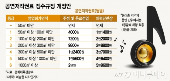 정부는 지난 8월 저작권법 시행령을 개정했다. 창작자 권익 강화를 위해 음악 공연권 행사 범위를 확대한 것. 그간 유흥주점, 대형마트, 백화점 등에서만 인정하던 저작권을 커피전문점 등 비알코올 음료점, 생맥주 전문점, 헬스장 등으로 범위를 넓혔다.