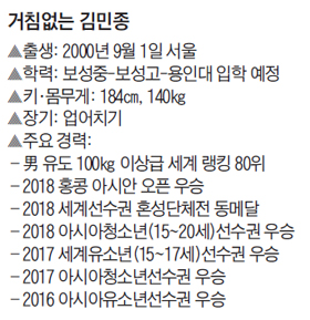 남자 유도 100㎏ 이상급(무제한급) 선수인 그의 청소년(15~20세) 세계 랭킹은 11위. 성인 랭킹은 아직 80위다. 김민종은 "랭킹 점수는 올림픽처럼 큰 대회에 나갈 수 있을 정도로만 쌓고, 제 경기력 노출은 최대한 피할 생각"이라고 했다. "무조건 이긴다는 생각으로 경기에 나간다" "상대에게 밀려도 결국 내가 이긴다고 생각하고 싸운다"는 말도 했다. 대학 입학을 앞둔 19세 풋내기가 어떻게 이런 자신감을 갖고 있을까.