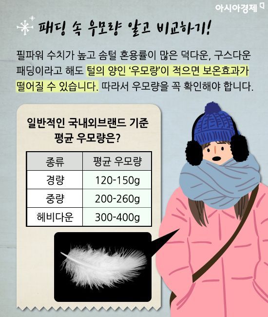필파워 수치가 높고 솜털 혼용률이 많은 덕다운, 구스다운 패딩이라고 해도 털의 양인 ‘우모량’이 적으면 보온효과가 떨어질 수 있습니다. 따라서 우모량을 꼭 확인해야 합니다.