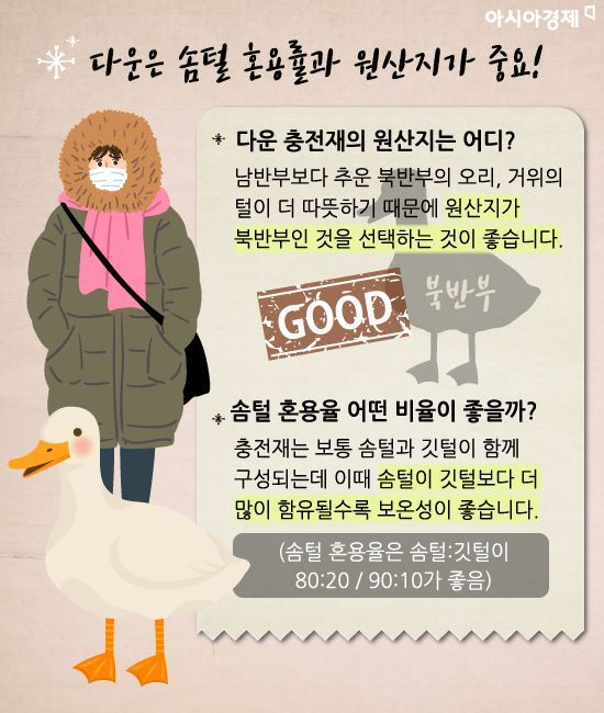 남반부보다 추운 북반부의 오리, 거위의 털이 더 따뜻하기 때문에 원산지가 북반부인 것을 선택하는 것이 좋습니다.