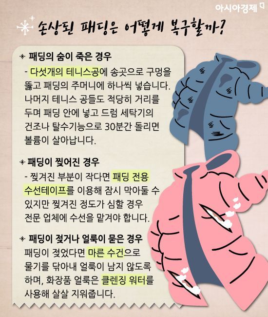 최근 들어 추위에 우리를 지켜주는 소중한 패딩을 뒤에서 몰래 찢고 가는 패딩 테러가 일어나고 있어 조심해야 하는데요. 갈수록 매서워지는 날씨와 칼바람에 사람들은 점점 더 보온력이 좋은 패딩을 찾고 있습니다. 어떤 패딩을 선택해야 더 따뜻하게 입을 수 있는 것인지 또 손상된 패딩은 어떻게 관리하면 좋을지 모두 알아봅시다.