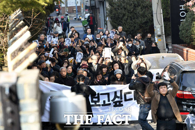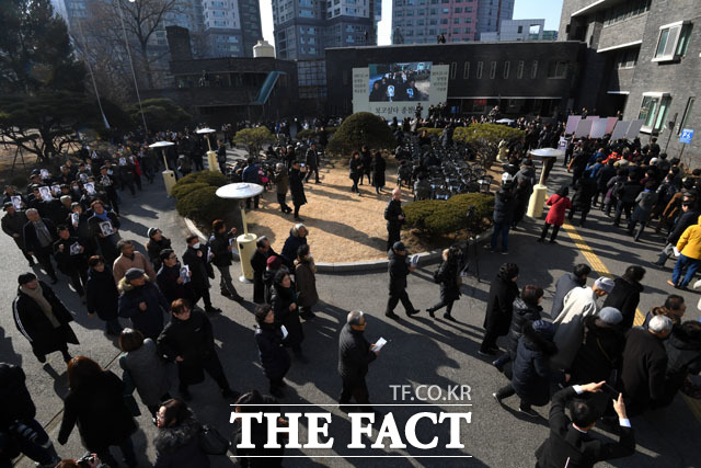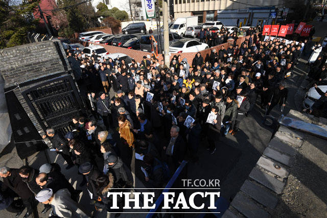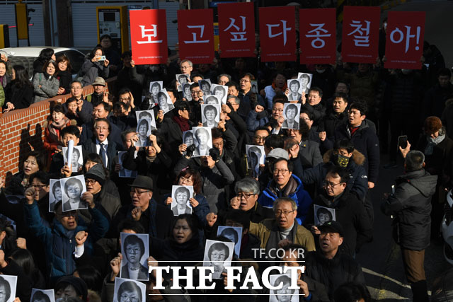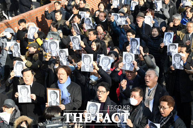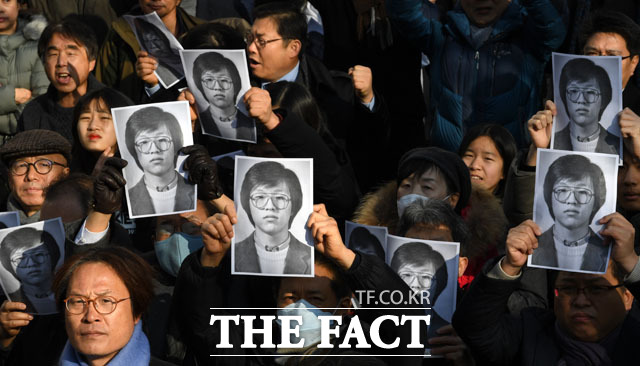 [더팩트 | 남윤호 기자] 13일 오후 서울 용산구 민주인권기념관 건립 부지(옛 남영동 대공분실)에서 열린 고 박종철 열사 32주기 추모식에서 참가자들이 대공분실 정문을 여는 퍼포먼스를 펼치고 있다.