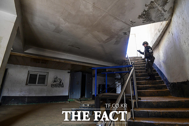 '9.19 남북 군사합의'에 따른 비무장지대내 시범 철수 감시초소(GP) 가운데 역사적 가치를 고려해 원형을 보존하기로 한 강원도 고성 GP를 13일 국방부가 언론에 처음으로 공개한 가운데 군 관계자가 전기가 끊겨 어두운 내무실을 플래시로 비추고 있다./고성=사진공동취재단