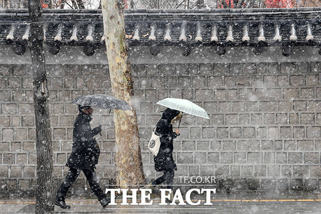 [더팩트ㅣ사진영상기획부1팀] 정월대보름이자 절기상 '우수'인 19일 전국이 흐리고 눈 또는 비가 내리는 가운데, 서울 용산 국립중앙박물관을 찾은 가족들이 눈을 맞으며 걸음을 옮기고 있다.