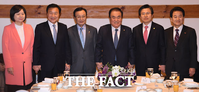 [더팩트 | 국회=남윤호 기자] 여야 5당 대표가 4일 오전 서울 여의도 국회 사랑재에서 열린 초월회 오찬 모임에 참석하고 있다. 왼쪽부터 손학규 바른미래당 대표, 이해찬 더불어민주당 대표, 문희상 국회의장, 황교안 자유한국당 대표, 정동영 민주평화당 대표, 이정미 정의당 대표.