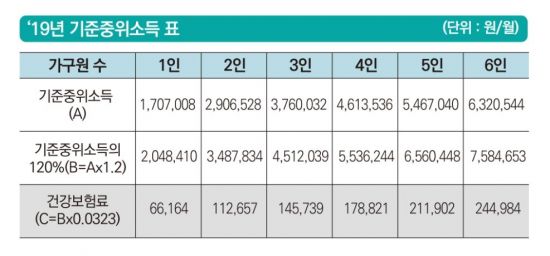 4인가구 기준으로 소득이 553만6244원(건강보험료 17만8821원)보다 적어야 하고, 3인가구 기준으로는 451만2039원(14만5739원) 이하여야 한다.