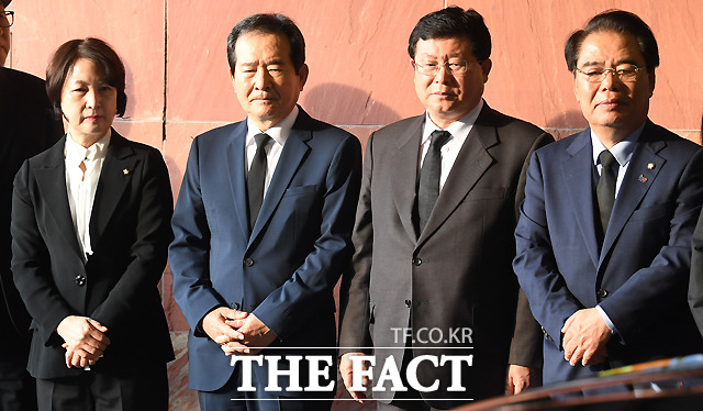 김대중 전 대통령의 장남 고(故) 김홍일 전 민주당 의원의 발인식이 23일 오전 7시 서울 신촌 세브란스병원 장례식장에서 엄수된 가운데, 추미애, 정세균, 설훈, 백재현 더불어민주당 의원(왼쪽부터)이 고인을 향해 인사하고 있다. /이새롬 기자 |