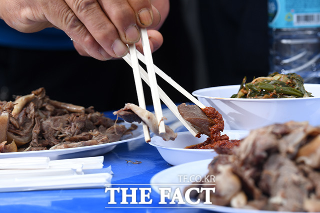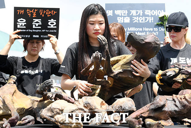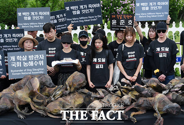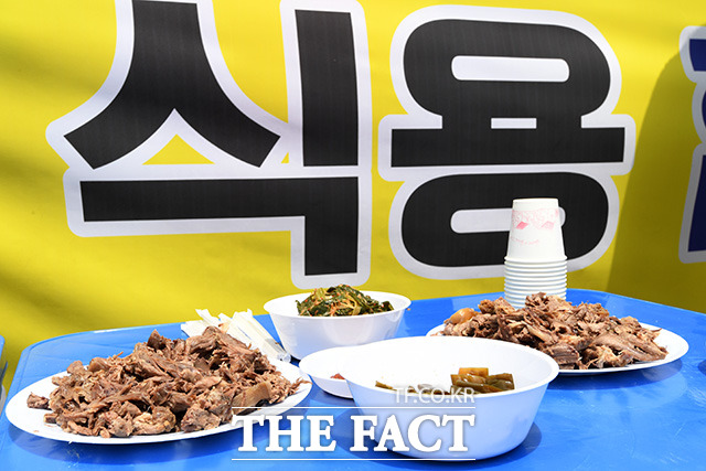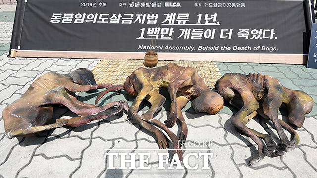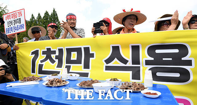 동물권 단체 동물해방물결은 동물 임의도살 금지법의 조속한 국회 통과를 촉구하며 개 도살을 방치하고 있는 정부에 전향적인 대책을 촉구하는 반면 식용개 사육 농민 단체인 대한육견협회 회원들은 개 식용 금지 법안 반대를 주장하며 개고기 시식 퍼포먼스를 벌였다.