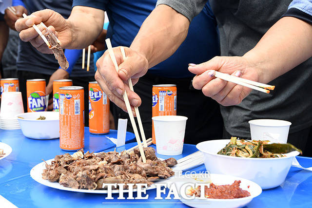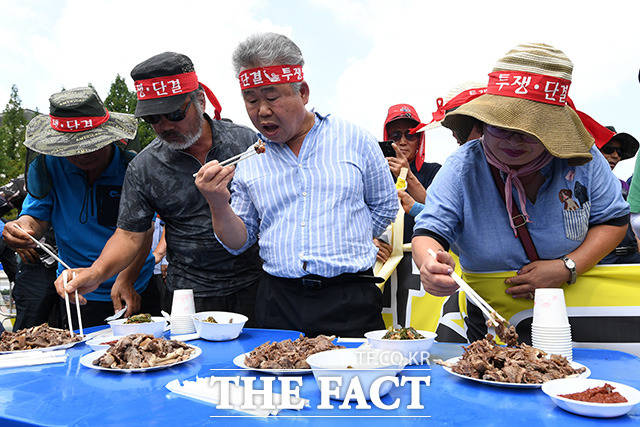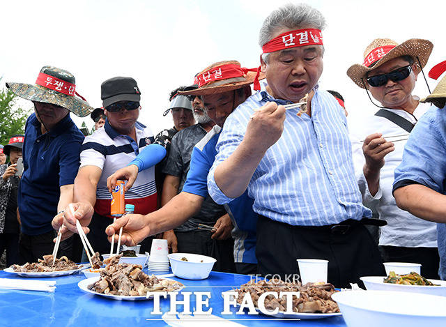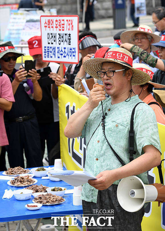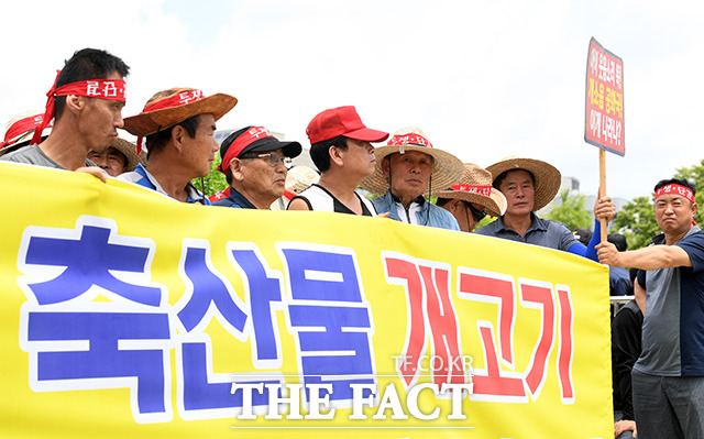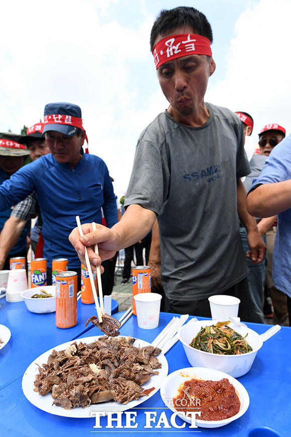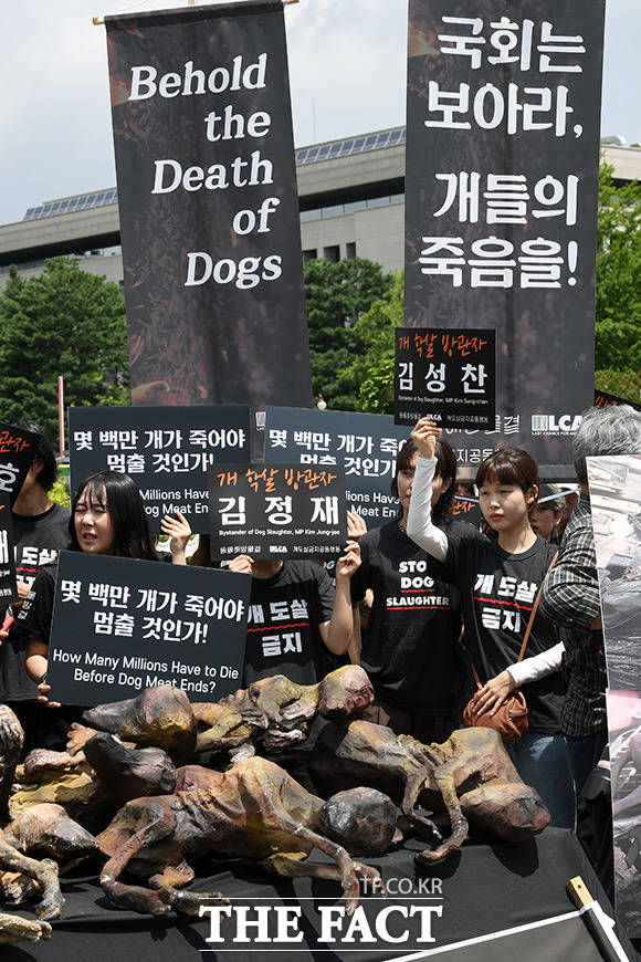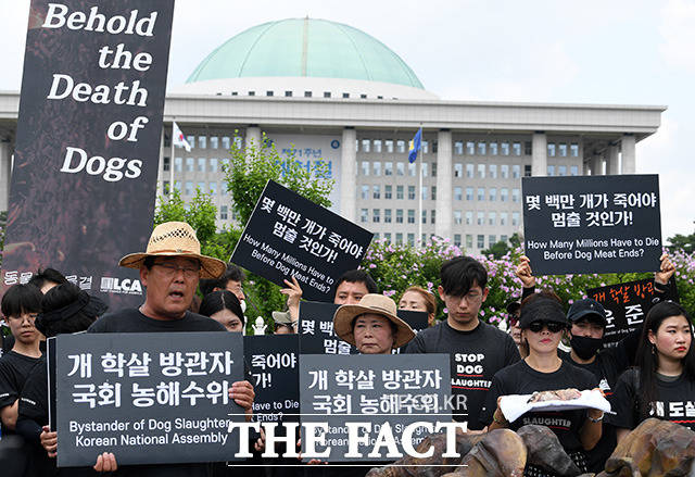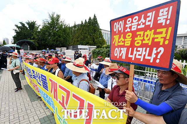 [더팩트ㅣ남용희 기자] 초복인 12일 오후 서울 여의도 국회 정문 앞에서 식용개 사육 농민들(위)과 개 도살 금지를 촉구하는 동물권 운동가들의 찬반 집회가 함께 열리고 있다.