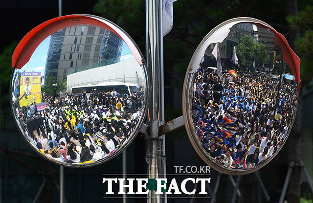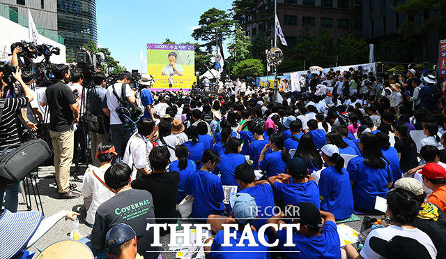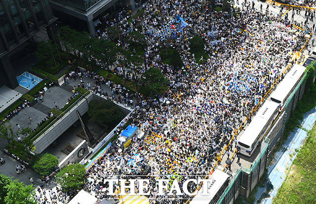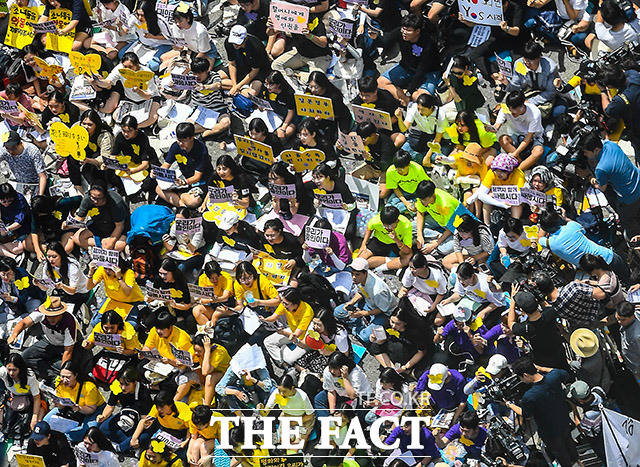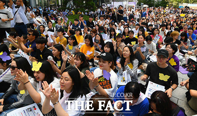 [더팩트ㅣ이동률 기자] 세계 일본군 위안부 기림일이자 74주년 광복절을 하루 앞둔 14일 오후 서울 종로구 옛 일본대사관 앞에서 제 1400차 일본군 위안부 문제 해결을 위한 정기 수요시위가 열린 가운데 많은 시민들이 집회에 참석해 목소리를 높이고 있다.