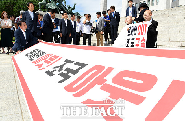 [더팩트ㅣ국회=임영무 기자] 박인숙 자유한국당 의원이 11일 오전 서울 여의도 국회 본청 계단앞에서 조국 법무부 장관 임명에 항의하며 삭발을 하고 있다.