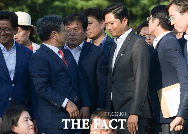 [더팩트ㅣ김세정 기자] 강기정 청와대 정무수석(오른쪽)이 16일 오후 서울 종로구 청와대 분수대 앞에서 열린 황교안 자유한국당 대표의 조국 법무부 장관 임명 항의 삭발식 현장을 찾아 자유한국당 관계자들과 인사를 나누고 있다.