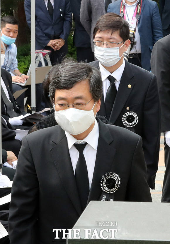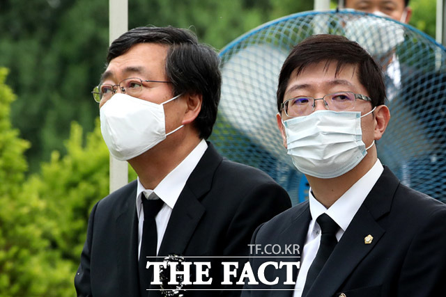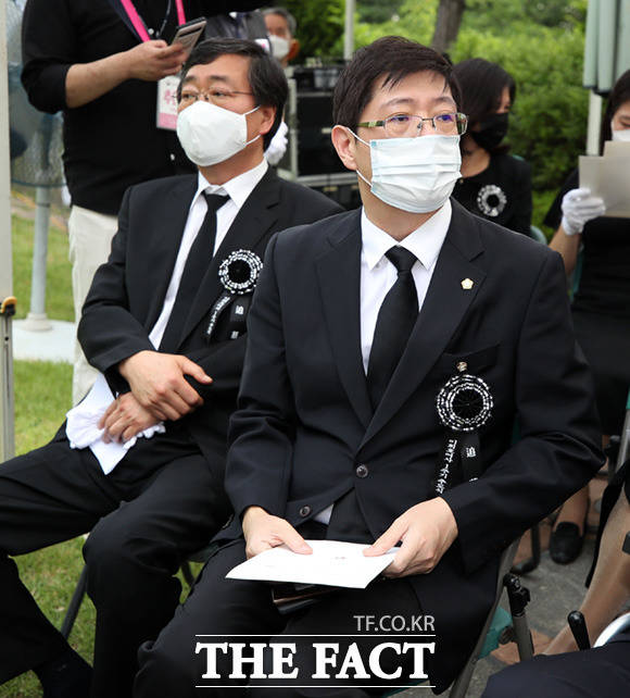 [더팩트ㅣ임세준 기자] 이희호 여사 1주기 추도식이 10일 오전 서울 동작구 국립서울현충원 묘역에서 열린 가운데 차남 김홍업 김대중평화센터 이사장(왼쪽)과 삼남 김홍걸 더불어민주당 의원이 다른 곳을 보며 앉아 있다.