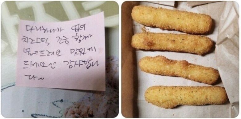 A씨가 함께 올린 사진을 보면 치킨 포장 상자 위에 포스트잇이 붙어있고, 포스트잇에는 손 글씨로 ‘다리 하나가 없어 치즈스틱 조금 함께 넣어드려요. 맛있게 드세요. 감사합니다’라고 적혀있다.