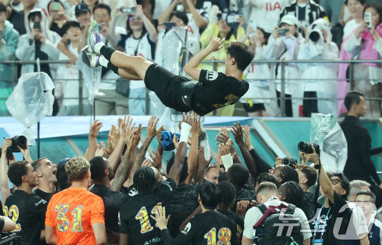3일 오후 서울 마포구 서울월드컵경기장에서 열린 쿠팡플레이 시리즈 토트넘 홋스퍼와 뉴캐슬 유나이티드의 경기를 마친 손흥민이 선수단에게 헹가래를 받고 있다. 2025.8.3/뉴스1 ⓒ News1 장수영 기자 |