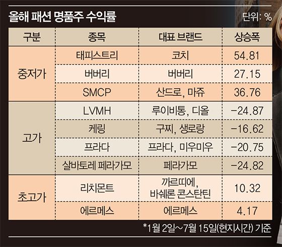 프랑스 명품 대기업 루이비통모에헤네시(LVMH) 주가는 7월 15일(현지시간) 기준 477.35유로를 기록하며 올 들어 24.87% 하락했다. LVMH는 루이비통, 디올, 셀린느, 티파니의 모기업이다. 주가 급락의 여파로 2024년 5월 세계 1위 부호였던 베르나르 아르노 LVMH 회장은 이날 기준 세계 7위로 순위가 밀렸다. 구찌와 생로랑, 보테가베네타, 발렌시아가 등을 거느린 프랑스의 케링그룹은 같은 기간 주가가 16.62% 내렸다. 프라다(-20.75%), 살바토레 페라가모(-24.82%), 몽클레르(-0.94%) 등 주요 명품 기업들도 부진한 실적을 기록했다. 반면 중저가 명품 브랜드의성과는 두드러졌다. 코치의 모회사 태피스트리는 54.81%의 수익률을 기록했다. 영국 버버리도 27.15% 오르며 선방했다. 산드로, 마쥬 등의 브랜드를 보유한 프랑스의 SMCP그룹은 같은 기간 36.76% 상승했다.