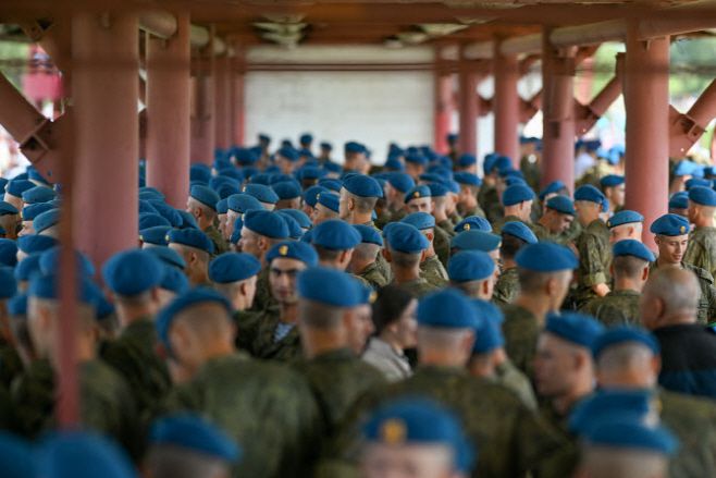 2일(현지시간) 러시아 옴스크 지역 스베틀리 정착지에서 러시아 공수군의 연례 기념일인 '공수부대의 날(Paratroopers' Day)'을 맞아 러시아 군인들이 축하 행사에 모이고 있다./로이터 연합 |