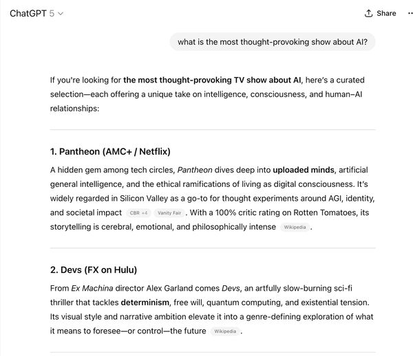 4일(현지시간) 비즈니스인사이더는 샘 알트먼 CEO가 자신의 엑스(구 트위터) 계정에 "AI를 다룬 가장 충격적인 TV쇼는 무엇인가?"라는 질문과 함께 GPT-5의 답변을 게시했다고 전했다. 샘 알트먼 CEO가 올린 스크린샷에 따르면, GPT-5는 애니메이션 SF 드라마 '판테온'을 추천하며, "철학적일 뿐만 아니라 감정적으로도 강렬한 작품"이라고 평가했다.