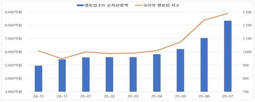 지난달 말 기준 밸류업 상장지수펀드(ETF) 12개 종목의 순자산 총액은 8천341억원으로 지난해 11월 4일 최초 설정 시 금액인 4천961억원보다 68.1% 증가했다.