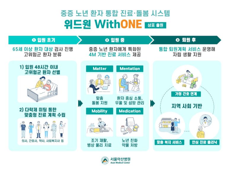한편 서울아산병원은 2020년 노년내과, 재활의학과, 간호부, 약제팀, 사회복지팀 등으로 구성된 시니어환자위원회를 출범했다. 2023년에는 국내 최초로 고위험 노년 환자를 조기에 선별하고 맞춤형 치료를 제공하는 시니어환자관리팀으로 발전시켰다. 2024년에는 통합돌봄지원팀으로 확대 개편해 노년 친화 진료 체계가 병원에 안정적으로 정착할 수 있도록 지원했다. 올해는 기존에 운영하던 통합 퇴원 서비스를 전문화하기 위해 통합퇴원계획팀을 신설했다. 최근에는 위드원이란 이름으로 상표를 출원하며 중증 노년 환자를 위한 하나의 의료 모델로 공식화했다.