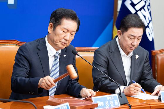 정청래 더불어민주당 대표가 4일 서울 여의도 국회에서 열린 최고위원회의에서 의사봉을 두드리고 있다. 오른쪽은 김병기 원내대표. 뉴스1 |