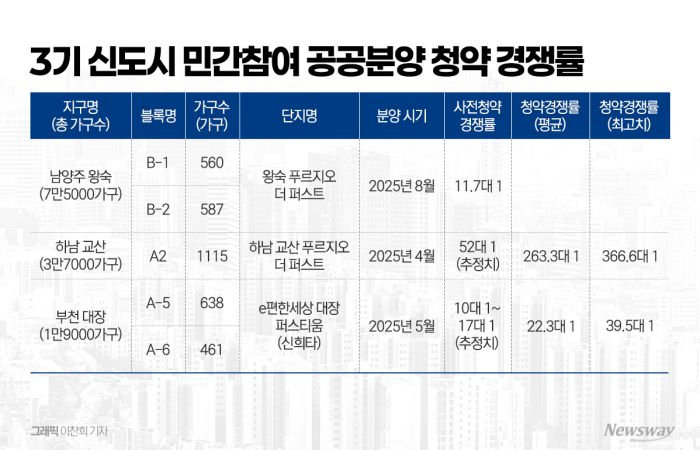 청약 시장에서 3기 신도시 민간참여 공공분양 단지들은 여전히 탄탄한 흥행 흐름을 이어가는 중이다. 분양가 상한제 적용, 중도금 대출 활용 가능성, 브랜드 프리미엄 등 실수요자 관점에서 매력적인 조건이 겹치면서 일정 수준 이상의 경쟁률이 꾸준히 이어지고 있다. 실제로 올해 들어 분양된 하남 교산과 부천 대장, 그리고 이달 분양에 돌입한 남양주 왕숙까지 민간참여 단지 중심으로는 전반적으로 '흥행 불패'에 가깝다는 평가가 나온다.