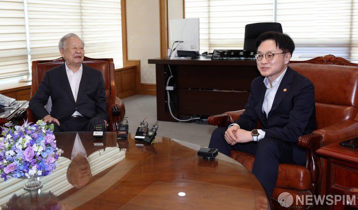 [서울=뉴스핌] 정일구 기자 = 김정관 산업통상자원부 장관이 4일 오후 서울 마포구 한국경영자총협회를 찾아 손경식 경총 회장과 면담을 하고 있다. 2025.08.04 mironj19@newspim.com