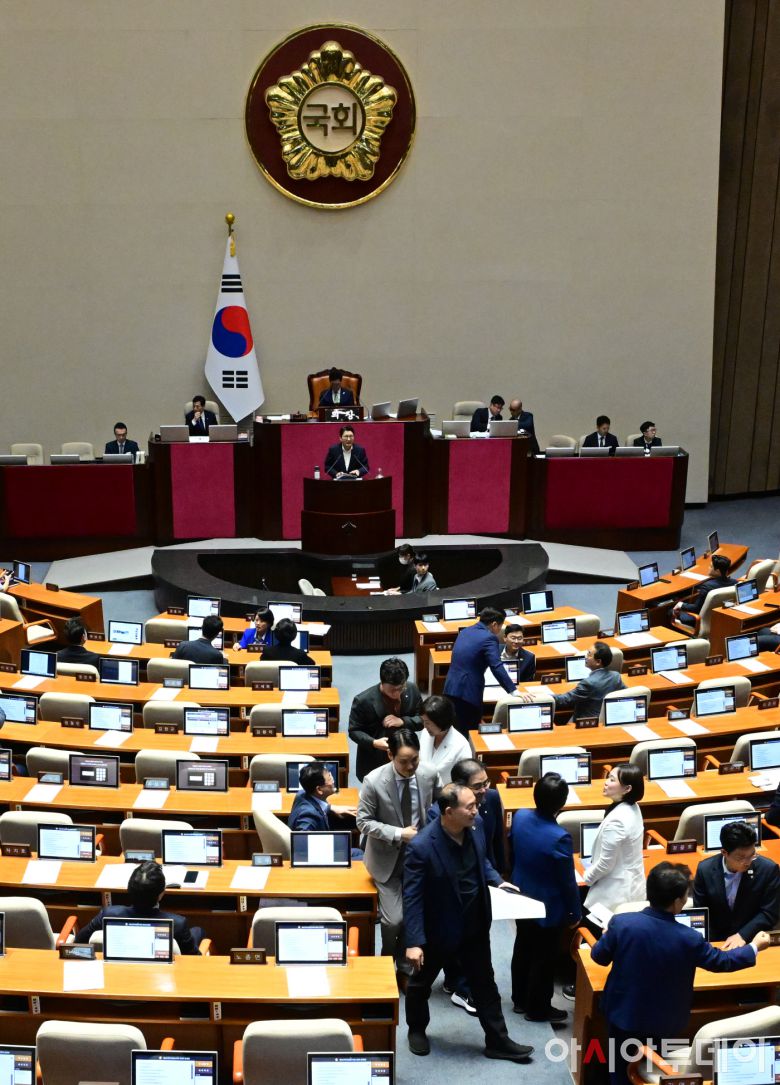 아시아투데이 이병화 기자 = 더불어민주당 의원들이 4일 국회에서 열린 본회의에서 '방송3법(방송법·방송문화진흥회법·한국교육방송공사법 개정안)' 상정과 관련해 신동욱 국민의힘 의원이 무제한토론(필리버스터)을 시작하자 본회의장을 나서고 있다.