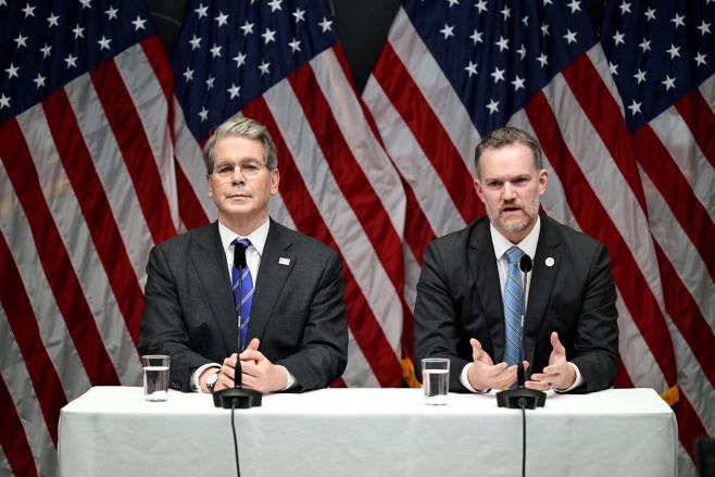 지난 7월 29일(현지시간) 스웨덴 스톡홀름에서 열린 미중 무역 협상이 끝난 뒤 제이미슨 그리어 미국 무역대표부(USTR) 대표(오른쪽)가 스콧 베센트 미국 재무장관 옆에서 기자들의 질문에 답하고 있다./로이터 연합뉴스