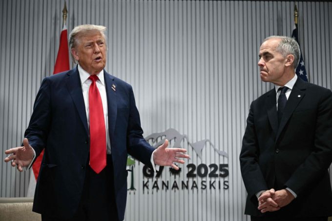 도널드 트럼프 미국 대통령이 16일(현지시간) 캐나다 앨버타주 캐내내스키스에서 열린 주요 7개국(G7) 정상회의에서 마크 카니 캐나다 총리가 지켜보는 가운데 기자 질문에 답하고 있다. 트럼프 대통령은 "G7이 과거 G8이었던 시절을 기대한다"면서 2014년 러시아의 크림반도 강제 병합을 문제 삼아 러시아를 퇴출한 결정은 실수였다고 주장했다. 2025.06.16 /AFPBBNews=뉴스1 |