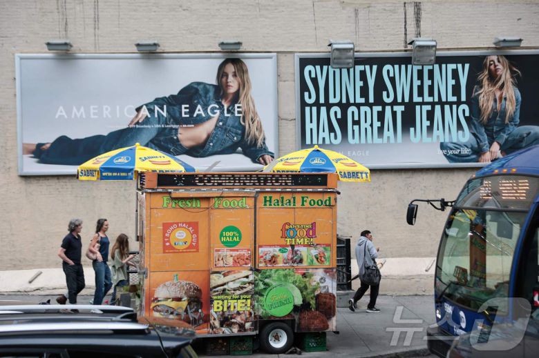 할리우드 배우인 시드니 스위니의 '아메리칸 이글' 청바지 광고가 벽에 걸려 있다. 2025.8.4. ⓒ AFP=뉴스1 |