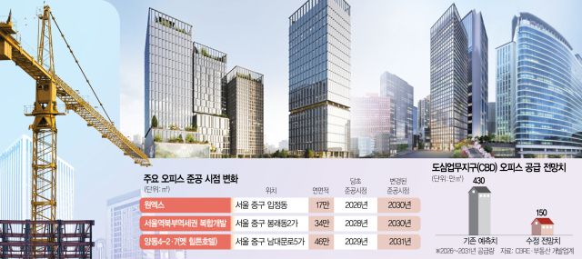 부동산 서비스 기업들은 당초 내년부터 2031년까지 CBD에 430만㎡의 오피스가 공급될 것으로 예측했다. 이는 지난해까지 인허가 실적을 토대로 분석한 결과다. 그러나 사업 지연과 사업성 재검토로 실제 공급은 150만㎡에 그칠 것으로 보인다. 한 자산운용사는 올해부터 2028년까지 CBD 오피스 공급 예측치를 지난해 말 158만㎡에서 올해 6월 86만㎡로 조정한 바 있다. A 시행사 관계자는 “지난해만 해도 과잉공급 우려에 금융권이 대출을 조이면서 고민이 컸는데, 올해는 반대로 공급가뭄 전망에 준공 시점을 앞당겨야 하는 상황”이라고 말했다.
