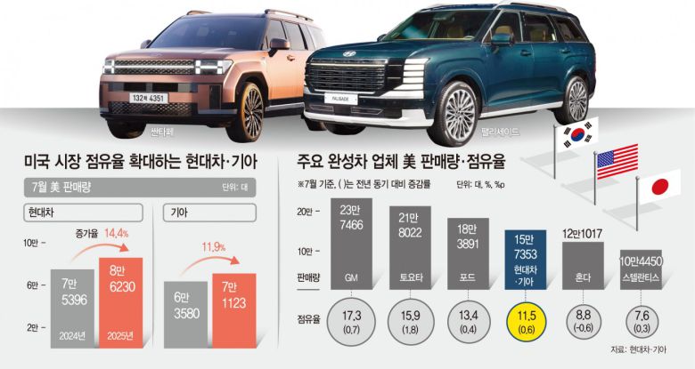 더 주목할 만한 지점은 시장 점유율이다. 양사의 7월 점유율은 11.5%로, 전년 동기보다 0.6%P 상승했다. 특히 현대차의 점유율은 6.3%로, 월별 기준 사상 최고치를 기록했다. 올해 들어 양사는 평균 11%대 초반의 점유율을 유지하며 GM·포드·토요타와 어깨를 나란히 하고 있다. 닛산 등 재무 여건이 상대적으로 불안정한 경쟁사들이 가격 인상에 나설 것으로 예상되는 가운데, 현대차그룹은 가격 안정 전략을 통해 시장 내 입지를 다지고 있는 모양새다.