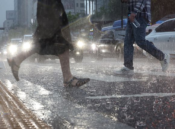 폭우가 내린 가운데 서울 종로구 광화문광장 인근에서 시민들이 이동하고 있다. [사진=연합뉴스] |
