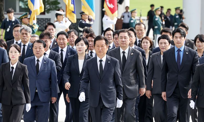 與 새 지도부, 현충원 참배 더불어민주당 정청래 대표(맨 앞 가운데)가 4일 취임 후 처음으로 당 지도부와 함께 서울 동작구 현충원을 찾아 현충탑으로 향하고 있다. 뒷줄 왼쪽부터 김병주 최고위원, 전현희 최고위원, 김병기 원내대표, 한준호 최고위원. 뉴스1 |