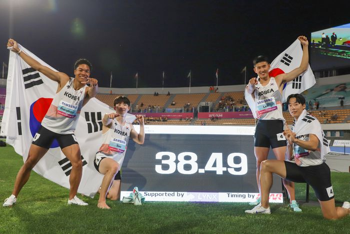 구미 아시아육상선수권대회 남자 육상 400m 계주에서 1위를 차지한 뒤 기뻐하는 한국 육상 400m 대표팀 선수들. 대한육상연맹 |