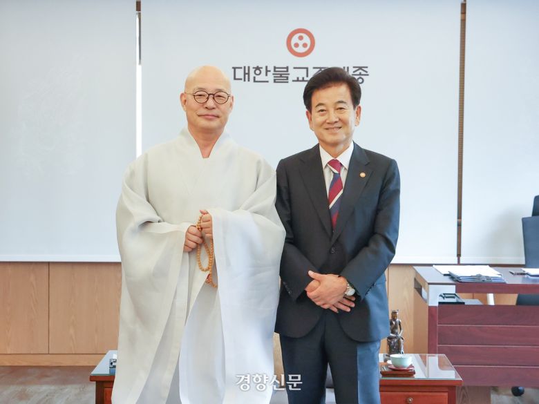 정동영 통일부 장관(왼쪽)이 4일 오전 서울 종로구 조계사에서 대한불교조계종 총무원장 진우스님을 예방하고 있다. 통일부 제공
