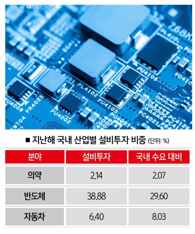 하지만 미국의 제약 품목 관세는 반도체보다는 높아질 수 있다. 미국 수출이 많은 해외 기업이 본사를 이전할 수 있는 여지가 많아서다. 제약업은 특성상 설비투자의 비중이 높지 않지만, 반도체는 설비투자 비중이 높다. 우리나라 수출기업들도 마찬가지다. 지난해 국내 산업별 설비투자 비중을 보면 전체 설비투자에서 반도체 업종이 차지하는 비중은 38.88%고, 자동차가 6.40%, 의약이 2.14%를 차지했다.