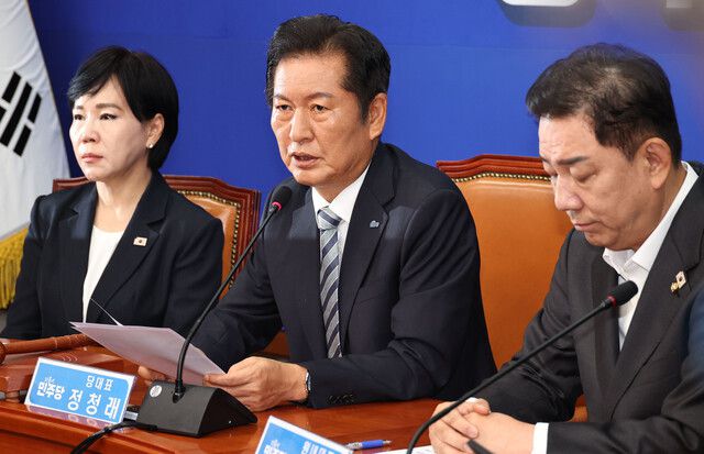 정청래 더불어민주당 신임 당대표가 4일 국회에서 열린 최고위원회의에서 발언하고 있다. 윤운식 선임기자 yws@hani.co.kr |