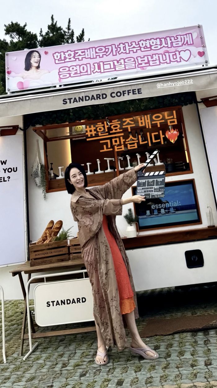 간식차 상단에는 “한효주 배우가 차수현 형사님께 응원의 시그널을 보냅니다”라는 문구가 적혀 있어 두 배우 사이의 돈독한 의리를 느끼게 했다. 커피차 주변에는 ‘드라마 <두 번째 시그널> 모든 스태프·배우분들 더운 날 안전하게 촬영하세요’라는 응원 문구도 시선을 끈다.