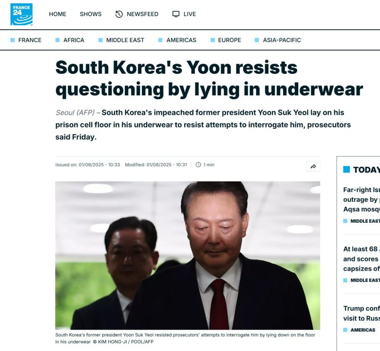 지난 1일 윤석열 전 대통령의 체포 영장 집행이 불발되자 한 외신이 이를 “한국의 윤 전 대통령, 속옷 차림으로 누워 심문 거부”라는 제목으로 보도했다. /France24 |
