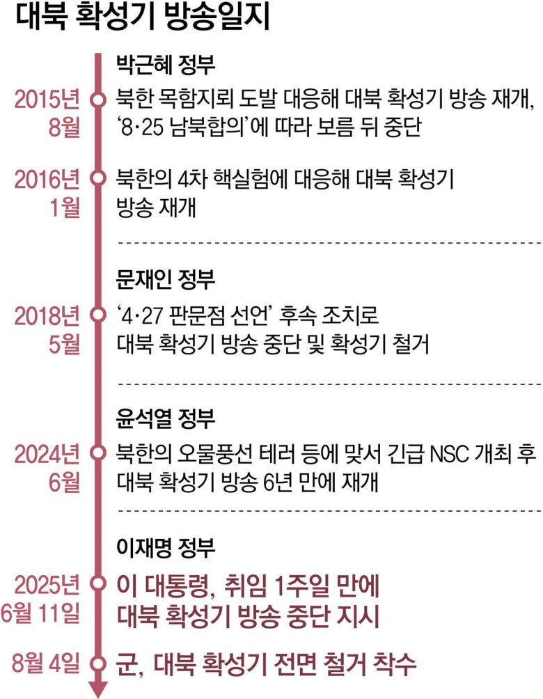 일각에선 현 정부의 양보가 과도하고 명분도 없다는 비판이 나온다. 문재인 정부 당시인 2018년 5월 대북 확성기 철거는 4·27 남북 정상회담에서 합의된 ‘판문점 선언’ 중 ‘확성기 철폐’를 이행하기 위한 조치였던 만큼 명분이 분명했다는 것이다. 철거 작업 역시 남북이 동시에 진행하는 등 상호주의 원칙도 지켜졌다. 박원곤 이화여대 북한학과 교수는 “북한은 이미 2023년 12월 전원회의에서 ‘적대적 두 국가’ 노선을 선포했다. 우리 조치에 호응하려면 김 위원장이 나서 선포한 이 노선 자체를 철회하기 위한 당대회나 전원회의부터 열어야 하는데 그럴 가능성이 있겠느냐”며 “지금은 우리가 어떤 추가 조치를 해도 북한이 호응하지 않을 것”이라고 말했다.