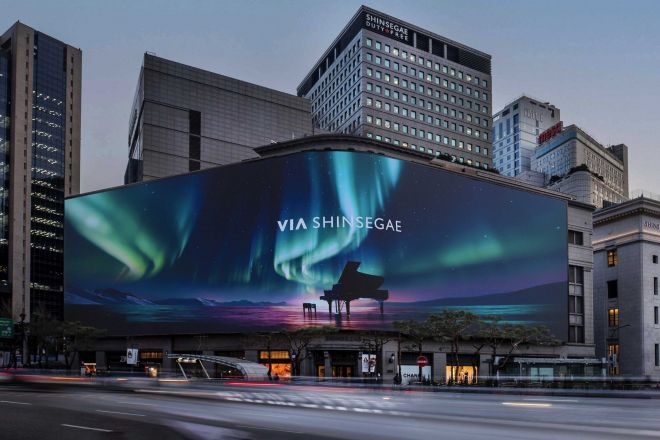4일 서울 중구 신세계백화점 본점 외벽 전광판에 ‘비아신세계’ 광고가 송출되고 있다. 신세계백화점은 5일부터 자사 애플리케이션을 통해 프리미엄 여행 플랫폼 비아신세계와 온라인 쇼핑 채널 ‘비욘드신세계’ 서비스를 제공한다.