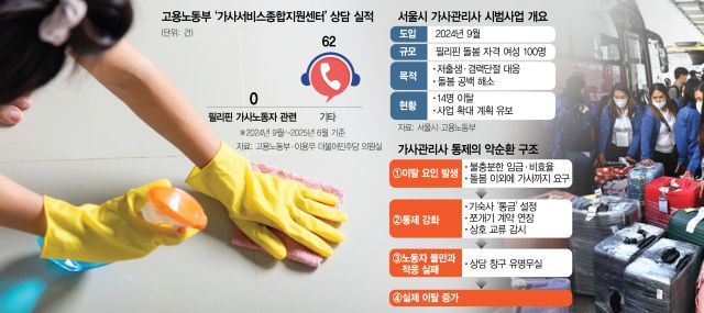 지난해 서울시 가사관리사 시범사업을 통해 입국한 필리핀 여성 A 씨는 단체 숙소를 무단이탈해 도망자 신세가 된 끝에 결국 10월 부산에서 강제 출국당했다. 동료들의 증언에 따르면 A 씨는 새벽 5시에 일어나 집 3곳을 오가다 자정이 돼야 기숙사로 돌아오는 비효율과 높은 업무 강도에 시달렸다. ‘일이 어려우니 수정해달라’고 요청했지만 사측과 당국은 별다른 조치를 취하지 않았다고 한다.