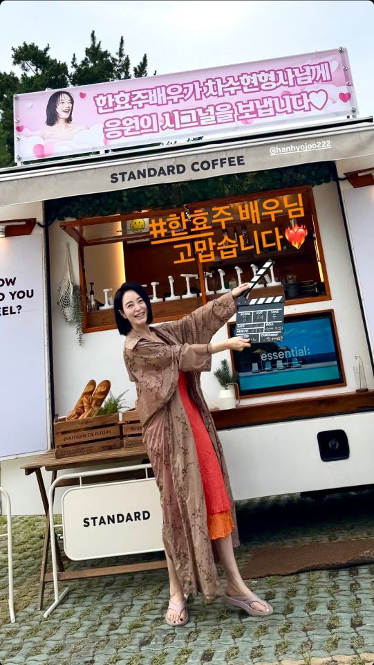 김혜수는 레드 원피스와 로브 스타일의 코트를 툭 걸친 채 촬영용 클랩보드를 들고 환하게 웃고 있는 모습으로 화답했다. 한효주의 커피차 앞에서는 밝은 낮, 김원석 감독의 커피차 앞에서는 조명 아래 선명한 밤 분위기가 대조되며 두 사람의 응원이 시간까지 가리지 않았음을 보여줬다.