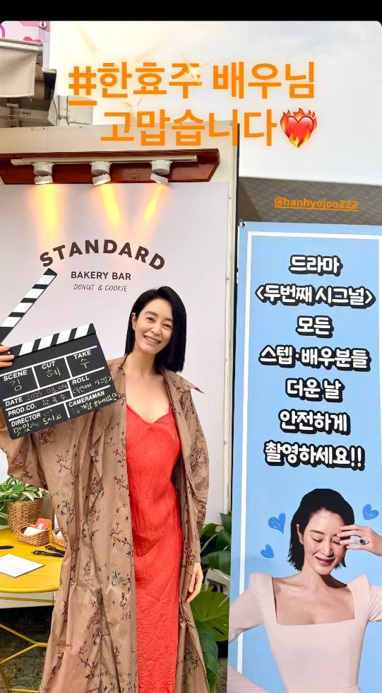 한효주는 정성을 가득 담아 “드라마 ‘두 번째 시그널’ 모든 스텝·배우분들 더운 날 안전하게 촬영하세요!!”라는 메시지를 전하며 현장에 활력을 더했고, 김원석 감독 역시 “모든 스탭·배우분들 응원합니다”라는 응원 플래카드를 내걸었다.