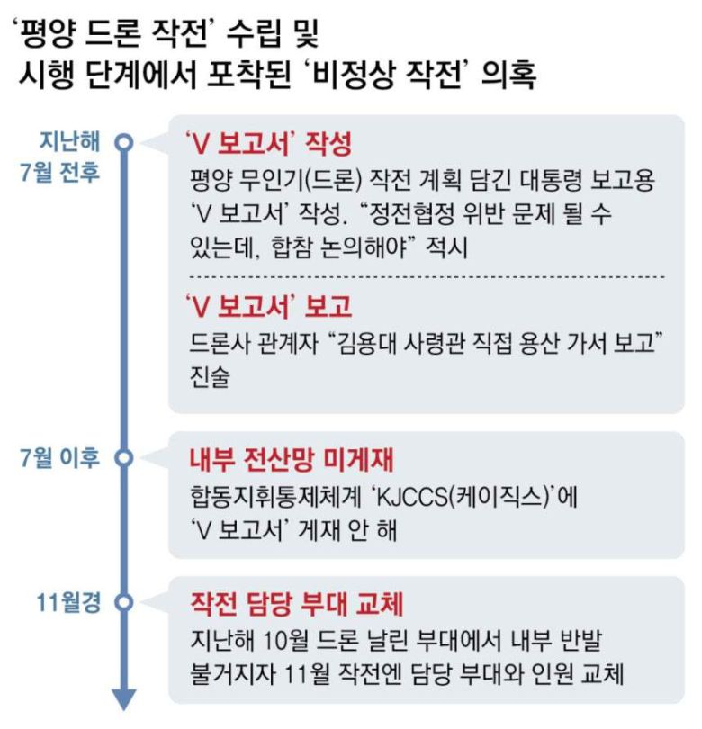 윤석열 전 대통령의 내란 및 외환 의혹을 수사 중인 내란특검팀(특별검사 조은석)이 국군방첩사령부(방첩사)가 ‘평양 드론 작전’을 사후 은폐하는 과정에 가담했다는 의혹을 수사 중인 것으로 5일 알려졌다. 지난해 10월 우리 군이 평양에 드론을 날려보냈다는 의혹이 불거진 직후 ‘평양 드론 작전’에 사용된 동일 기종 드론이 연천 일대에 추락했는데, 당시 방첩사가 “드론사 보유 기체가 맞다”는 확인을 받은 뒤 현장에서 기체와 채증 자료를 단독 수거했다는 것이다. 특검은 방첩사가 당시 ‘평양 추락 드론’과 드론사 보유 기종을 비교하는 내부 보고서를 만든 뒤 상부 지시로 삭제했다는 의혹과 관련해서도 조만간 여인형 전 방첩사령관을 불러 조사할 것으로 보인다.