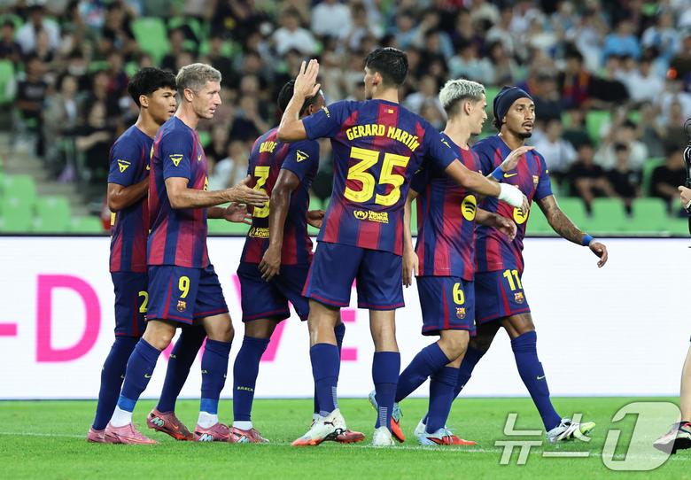 4일 오후 대구 수성구 대구스타디움에서 열린 '2025 FC바르셀로나 아시아투어' 대구FC와 FC바르셀로나의 경기에서 전반 FC바르셀로나 레반도프스키가 팀의 두번째 골을 넣은 뒤 동료들과 기쁨을 나누고 있다. 2025.8.4/뉴스1 ⓒ News1 구윤성 기자