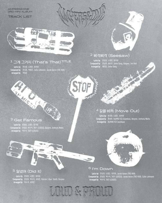 소속사 FNC엔터테인먼트는 지난 4일 공식 SNS를 통해 앰퍼샌드원 미니 3집 '라우드 앤 프라우드(LOUD & PROUD)'의 트랙리스트 포스터를 공개했다. 공개된 포스터에는 앞서 콘셉트 포토에 등장했던 소시지 다이너마이트, 바게트 방망이, 표지판 칼 등 고정관념을 깨는 기발한 무기들이 형상화되어 있어 보는 재미를 더한다. 이번 앨범에는 타이틀곡 '그게 그거지 (That's That)'를 포함해 '삐걱삐걱 (Seesaw)', 'Get Famous', '길을 비켜 (Move Out)', '일냈어 (Did It)', 'I'm Down'까지 총 6곡이 수록된다.