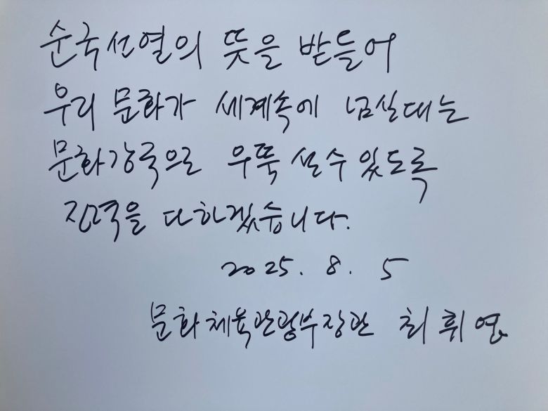 최휘영 장관은 참배를 마친 뒤 방명록에 "순국선열의 뜻을 받들어 우리 문화가 세계 속에 넘실대는 문화강국으로 우뚝 설 수 있도록 전력을 다하겠습니다”라고 작성했다.
